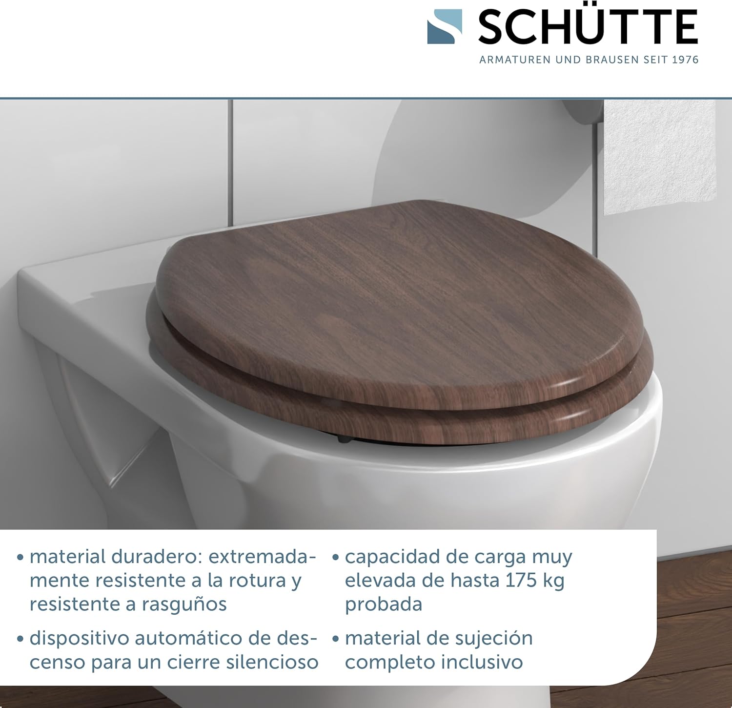 Esta tapa de WC con asiento está fabricada en madera MDF. Este material es especialmente duradero y su asiento es muy cómodo gracias a la superficie de calidad. Su superficie es lisa y porosa lo que hace que su limpieza sea sencilla. Esta tapa de inodoro dispone de un doble mecanismo que hace que su cierre sea lento y silencioso y lo protege de golpes y molestos ruidos.